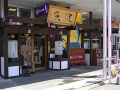 左: 「魚健」は海鮮丼と寿司の店、11時半〜21時。まぐろ丼714円〜中トロ丼1680円、あら汁210円、刺身と煮魚定食1200円など。