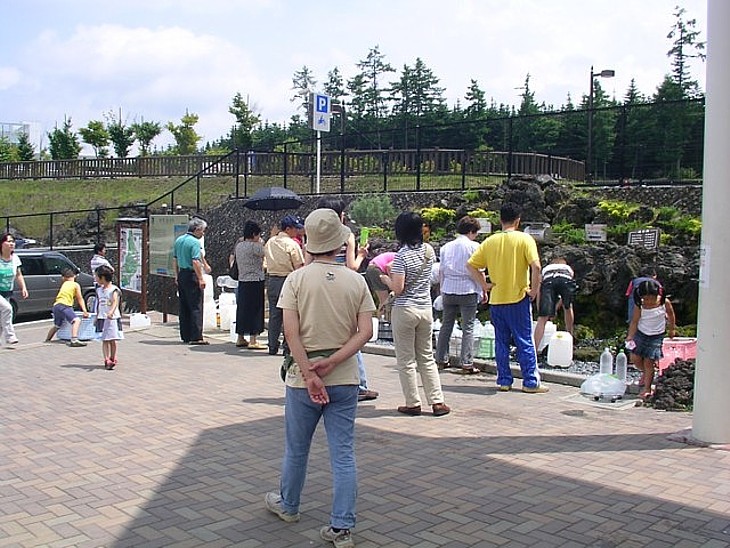 いつも人の列が絶えない「富士の名水」スポット。沢山のポリタンクで業務用に利用する客も多い。