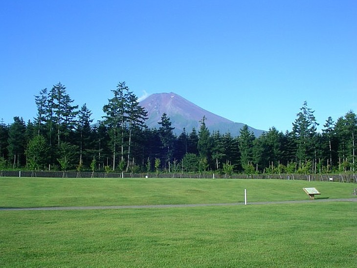 芝生広場から見た初夏の富士山。芝生への立ち入りは人も犬も自由だから汚さずに利用したい。