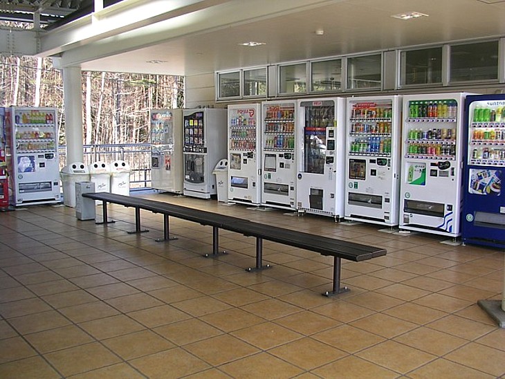 自販機コーナーには簡単な休憩施設もある。やや殺風景だが寒い季節以外なら利用価値は高い。