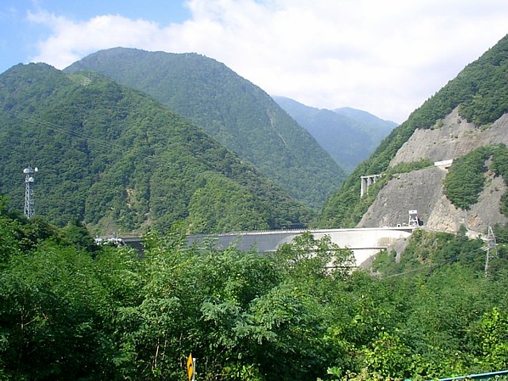駐車場のすぐ下には上高地から流れ下ってきた梓川をせき止めた水殿ダム。ダムサイトにも駐車可能だ。