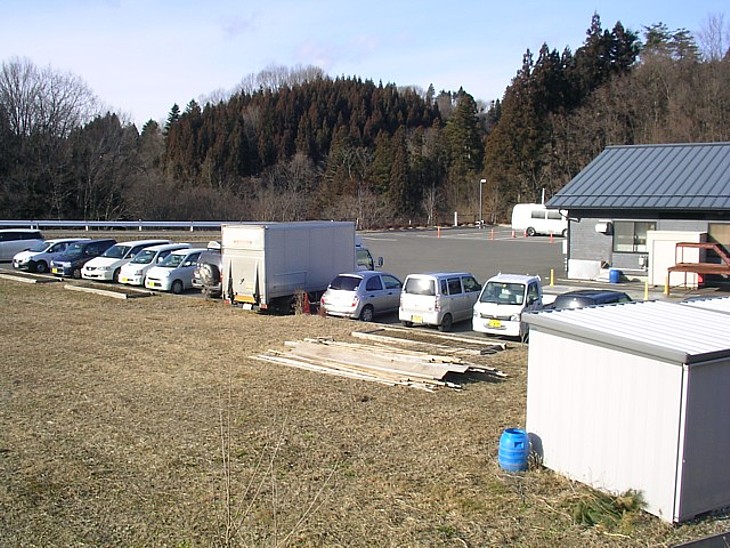 国道沿い左側の緑地から中庭の駐車場方向を撮影。全体に車を停めるスペースはかなり広い。
