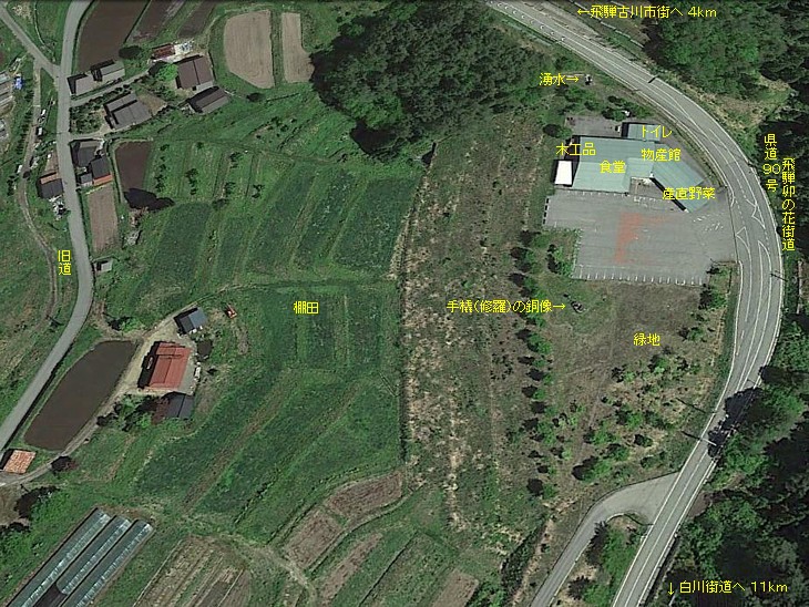 飛騨古川の市街から約4km西、名水「いぶし銀」の湧く林業の里。丸太を運ぶ手橇(修羅?)の像が迫力!