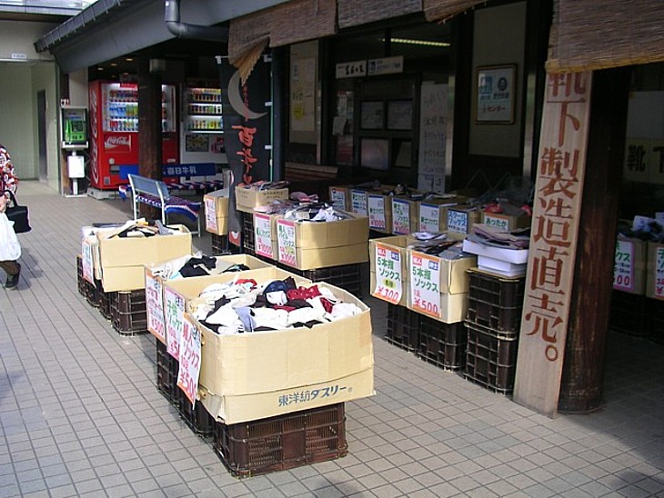 この日は駅頭で靴下の製造販売コーナーが営業中。地場産業の一つには「メリヤス」がある関係だろうか。