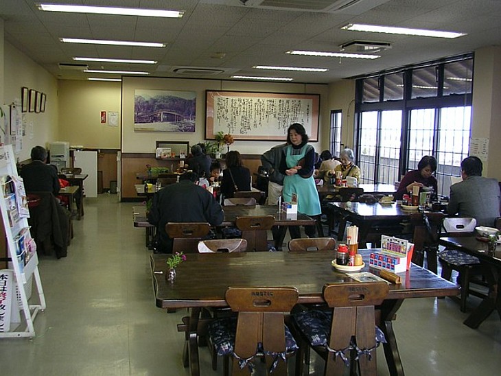 物販の奥には比較的に広い食事処。食券方式だが、セルフサービスは採用しておらず、利用者は結構多い。