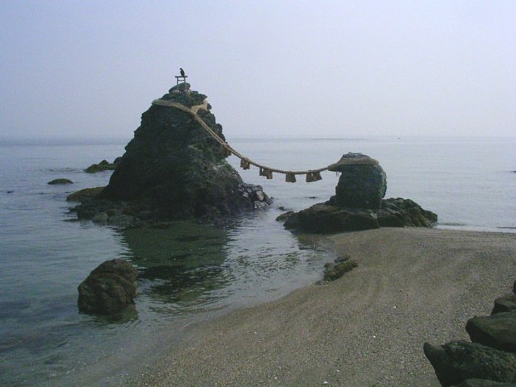 二見ヶ浦−03 撮影の定番アングル、夫婦岩。男岩の鳥居に海鵜が一羽、休憩中。