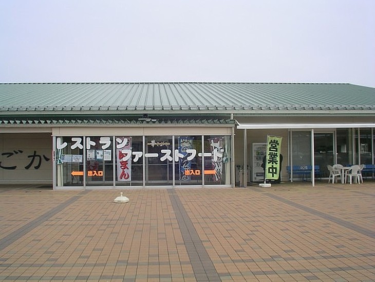 右端の食事処入口。地粉の手打ち蕎麦やローズポーク料理が売りで、珍しいナマズの天ぷらもある。