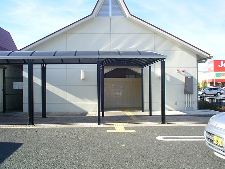トイレの前には屋根があるが駅舎との間に車路があり、雨の日にはやや不便。左が休憩室で右側がトイレ棟。