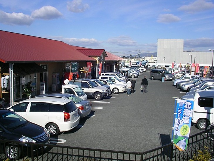 「タケル館」前の駐車場(約30台)も昼前後は麻痺状態。背後の国道沿いには大型の食品スーパーがある。