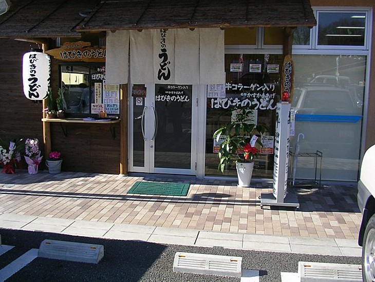 左隅の「はびきのうどん」入口の風景。きつね・つきみは550円、てんぷら700円、にく750円..やや高い?