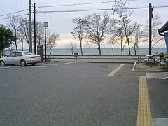 湖岸の県道から2km弱の距離に並行して国道8号が通っており、駅前の交通量は少ない。P泊する車も何台か。 |