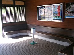 物販棟には休憩施設なし、トイレには一応ベンチが置いてある。文化センターの快適なロビーは9〜18時の間利用できる。 |