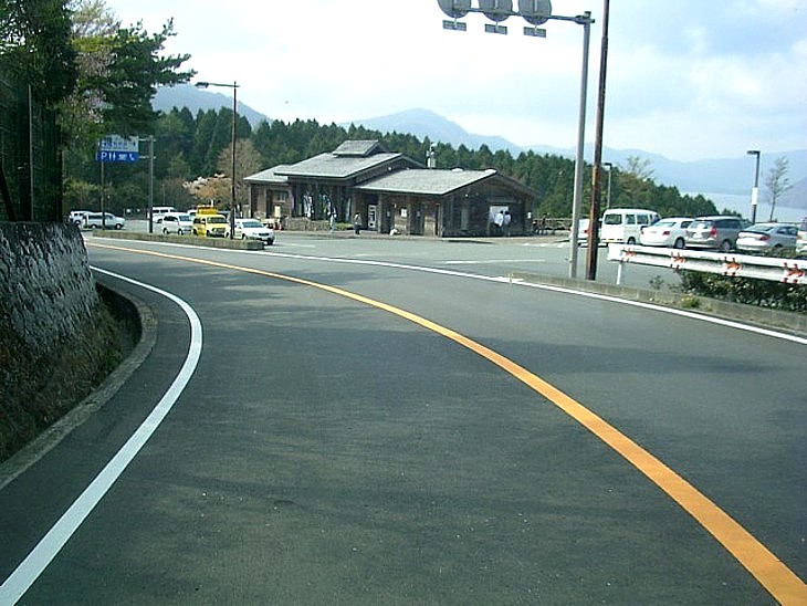 箱根峠側から駅を。駐車場は国道沿いに長く敷地両側がメイン、駅舎の前にも数台が停められる。
