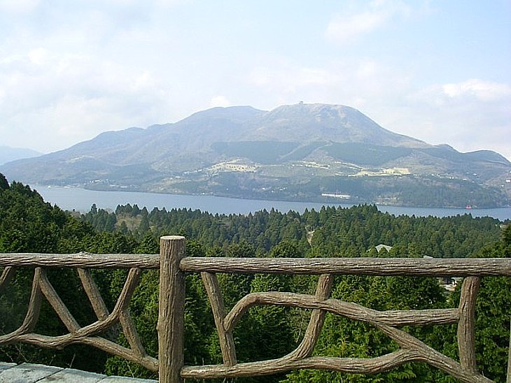 眼下に芦ノ湖、右隅に箱根神社の「湖上の鳥居」が見える。正面に聳えるのは駒ヶ岳(1356m)。