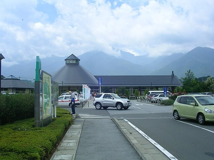 誘導路の突き当たりが駅舎、左右に駐車スペースが広がる。左折した左側が大型車用、背景は南アルプス。
