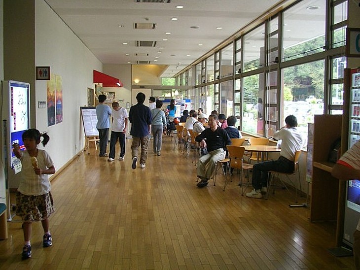 右側の通路は明るい休憩コーナーを経て食事処へと続く。弁当を広げている家族連れも多い。