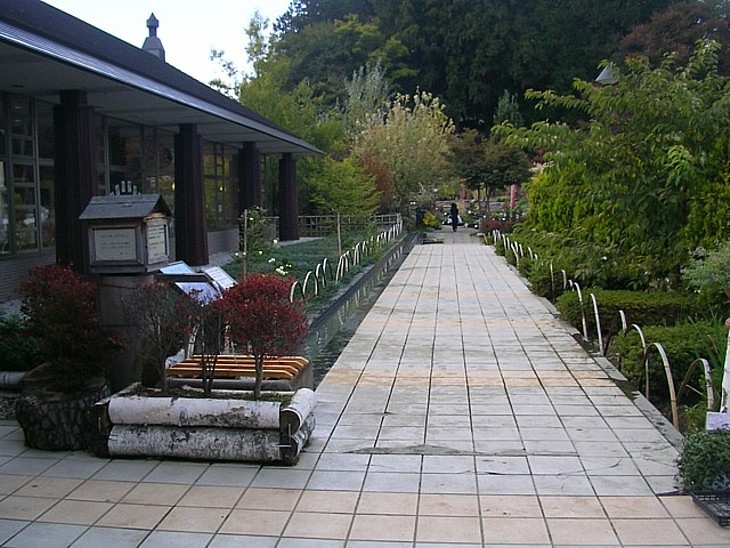 溢れた天然水は建物に沿って石畳の横を流れる。この先には遊歩道が伸び、園芸コーナーに続く。