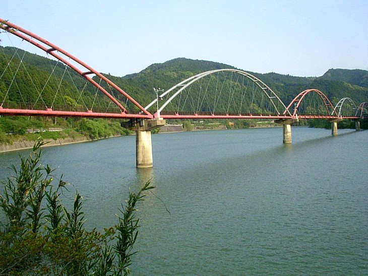 湖水を渡る「夢のかけ橋」は中止になった旧国鉄佐久間線の橋脚などを再利用し平成11年に完成。