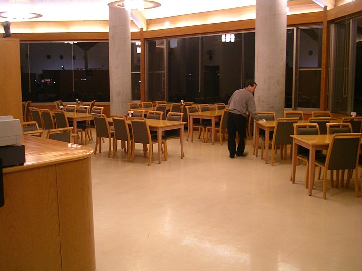 窓が大きくて明るい雰囲気の食事処「天領」。メニューは平凡だが価格は安め、地元の食材を多用している。
