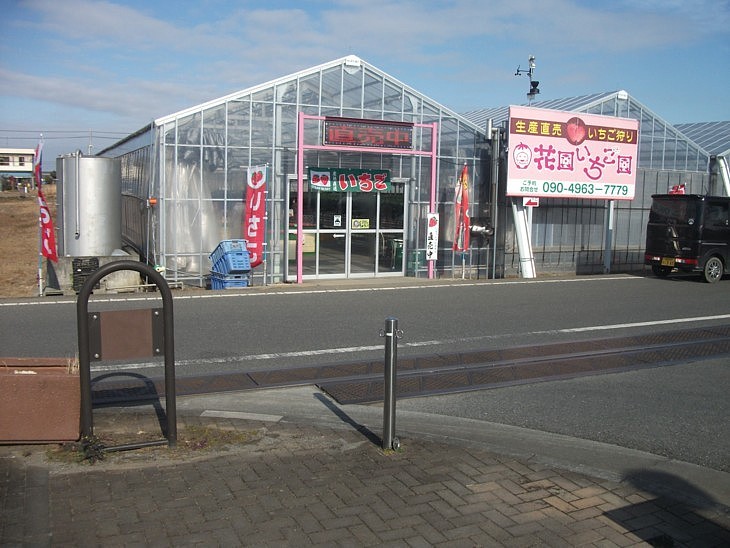 「ひだまりの公園」横のスイーツ専門店・花園フォレスト。庭には薔薇の咲き、数軒のテナントが営業している。