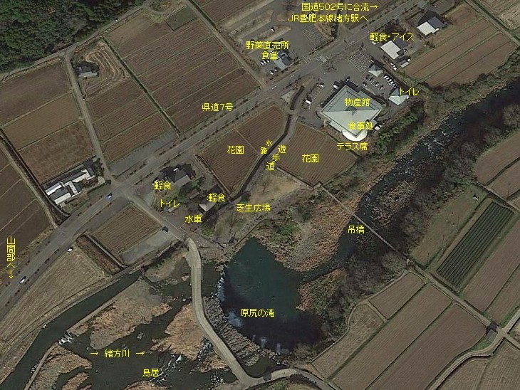 日本の滝百選の一つ・原尻の滝が目の前、周辺には花畑や桜並木や吊り橋も整備され賑やかになった。