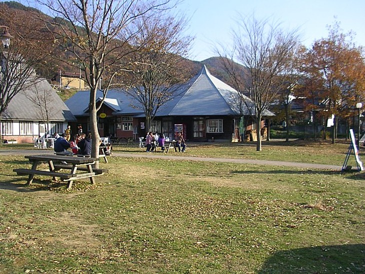 芝生と樹木の中庭にはガーデンテーブル数台が置かれている。向かい側は地元の拠点施設と加工場。