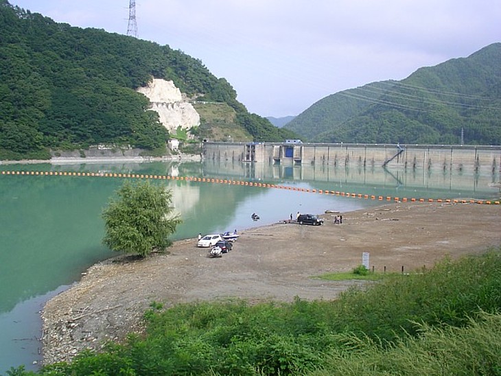 美和ダムの横には車で湖水まで降りるルートがある。急に深くなるから要注意だが、軽い水遊びならOK。