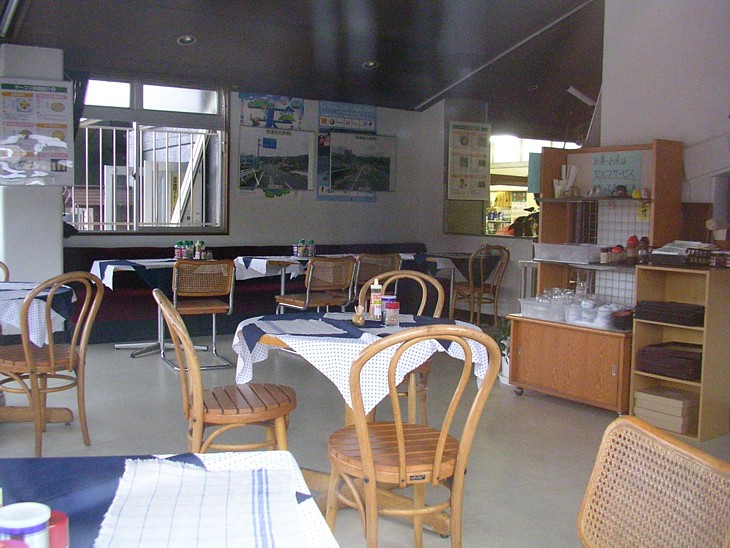 食事処の内部。他人事ながら、木質系の床にすれば雰囲気がもっと良いのに、とも思う。