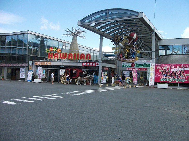 右側がハワイアン・コーナー入口。手前が売店とカフェと総合案内、奥が有料施設(ショーの有無により700円〜)