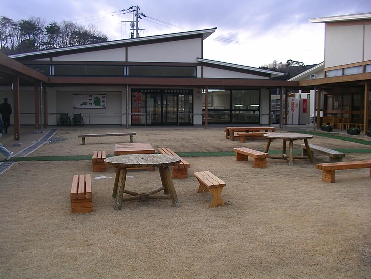 芝生の奥には情報・休憩・トイレ設備がある。メイン駅舎や障害者用駐車場とは屋根で結んでいる。