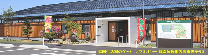 園芸ツールや産直野菜を扱う「体験館」の一画が緑に囲まれたカフェコーナー。ここにもテラス席あり。 | |