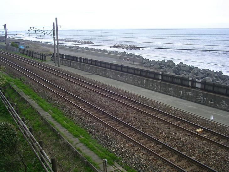 紹介コーナー窓のすぐ下には北陸本線が走っている。こちらは海に沿って富山県に向かう線路。