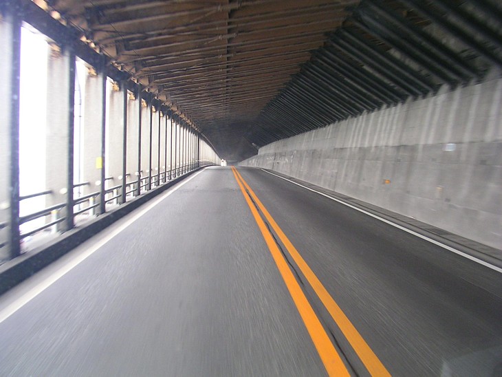 糸魚川へ向う国道のスノーシェッド。「道の駅親不知」手前の展望台付近の下り坂が最大の難所。