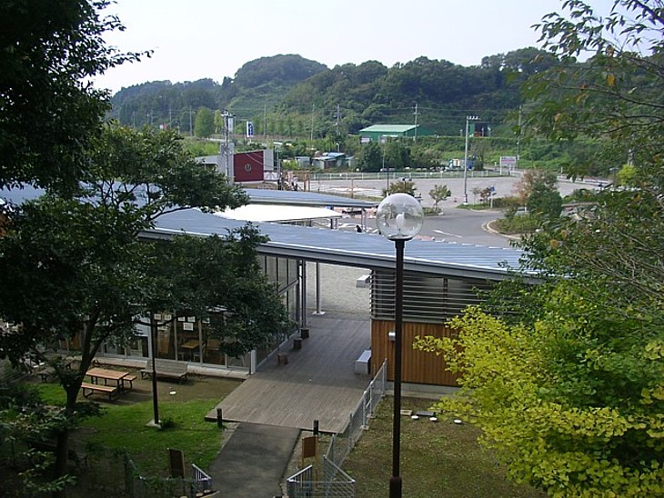 「植物公園」の階段上から駅の敷地を。駅舎裏にもガーデンテーブル、日差しの強い季節には涼しそうだ。