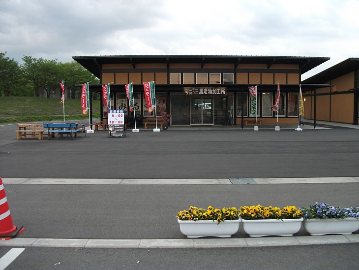 駅舎の左端が「農産物加工所」。ガラス張りの加工室で作った食品や手作り弁当などを扱っている。