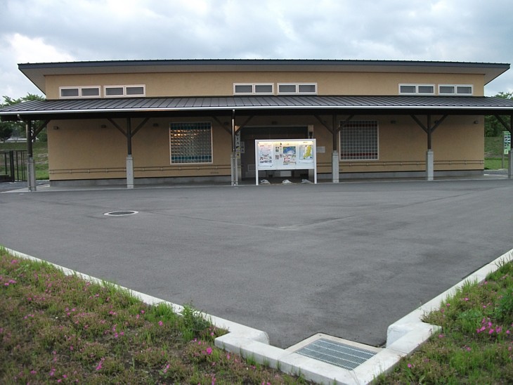 敷地左端のトイレ棟。洋式便器は障害者兼用も含め全てウォシュレット付き、設備は良く整っている。