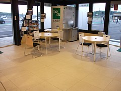 上: 敷地右端の「まちおこしセンター」は9時〜18時。休憩室を兼ねた情報交換と地域の交流・活性化を目指している。目的に即した活用は