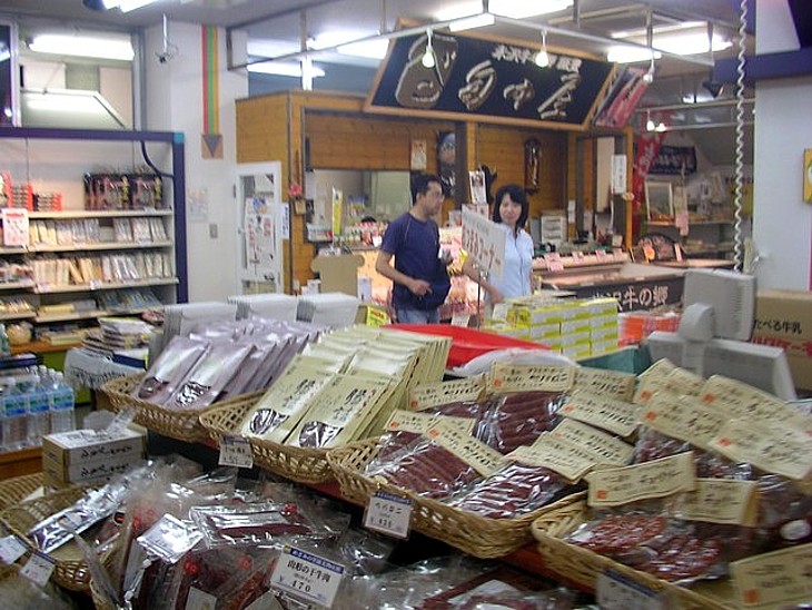 牛肉はパック数千円レベルの商品が多い。休日には観光バスのツァー客や近隣の買物客で大混雑になる。
