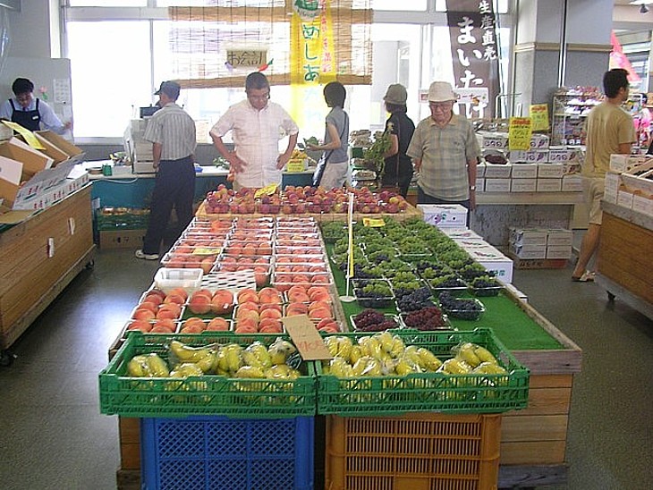 山形県は果物の一大産地で桃・サクランボ・プラム・ブドウが安い。ついでに並べたバナナも売れるのだろう。