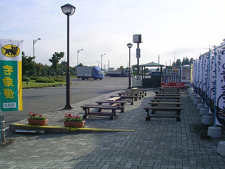 民芸品の建物の前にもガーデンテーブルを置いている。新らしい駅が2軒開いて混雑は緩和しただろうか。