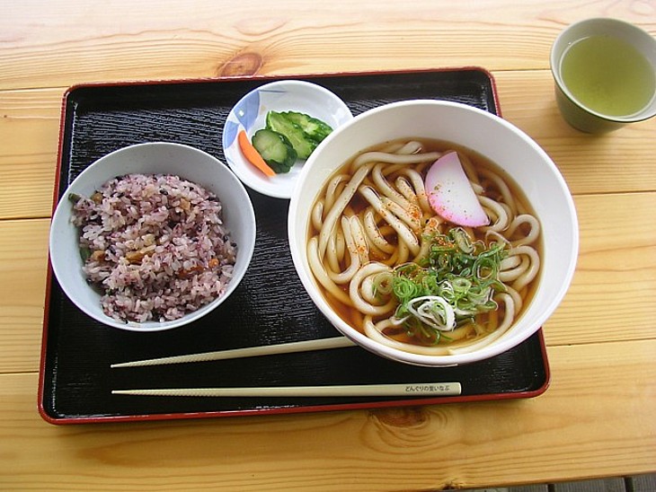 人気メニューの古代米プラスかけうどんの「横丁セット」、720円。リーズナブルだし味も悪くない。
