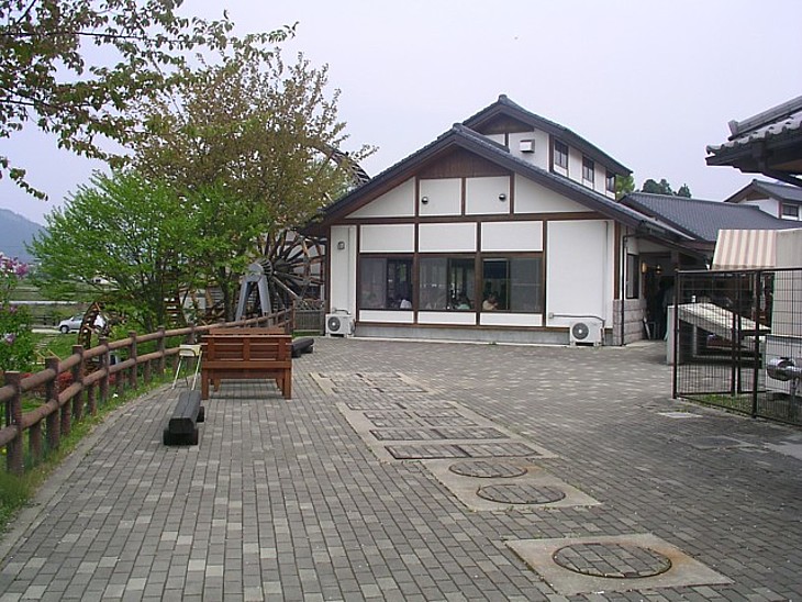 「水車館」の横で二連水車が廻る。トイレの裏で雰囲気は悪いがガーデンテーブルが置いてある。