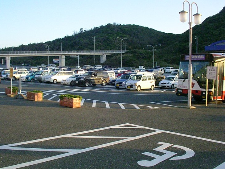 駅舎前から岬への歩道橋を。駐車場は広くて収容力も高い。右手には豊橋行き路線バスの停留所もある。