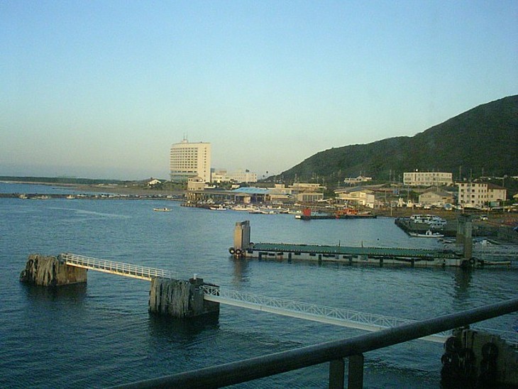 観光用桟橋と遊覧船桟橋の先は伊良湖漁港、山裾に伊良湖ガーデンホテルの前には広い海水浴場が続く。