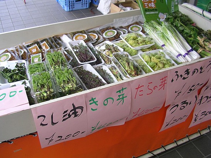 この地域の山菜は4月初旬がピークらしい。店頭にはワラビ・タラの芽・フキノトウが沢山残っていた。