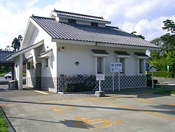 蔵造り風白壁の別棟トイレに併設、24時間利用できスペースも広い。ベンチのみでテーブル類がないのはいささか不便だ。 | |