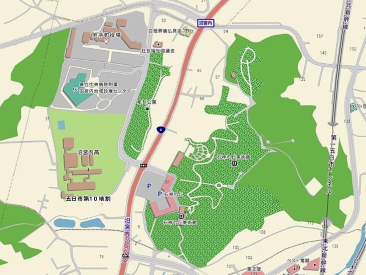 国道4号線の西側に市役所などの公共施設、東側の丘全体を公園・美術館・道の駅に利用している。