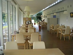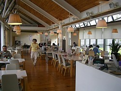 ● レストランは10時半〜19時(11〜3月は18時)、地域性は薄いがメニューは豊富で安い。木の床と大きな窓の雰囲気も良い。