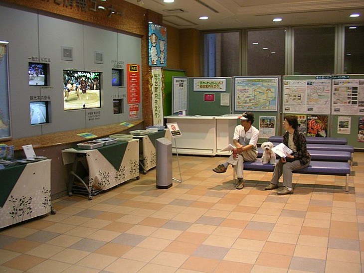トイレ横の広い休憩施設。テーブルはないが落ち着ける。ペット連れで公共施設に入る夫婦、反面教師だね。
