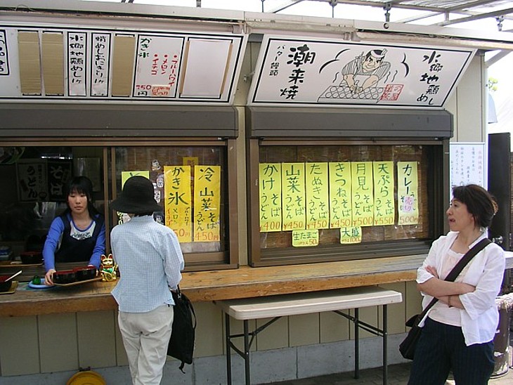 中庭左の軽食の店では麺類やお握りも扱っている。ベンチで食べるのは味気ないが良く売れていた。